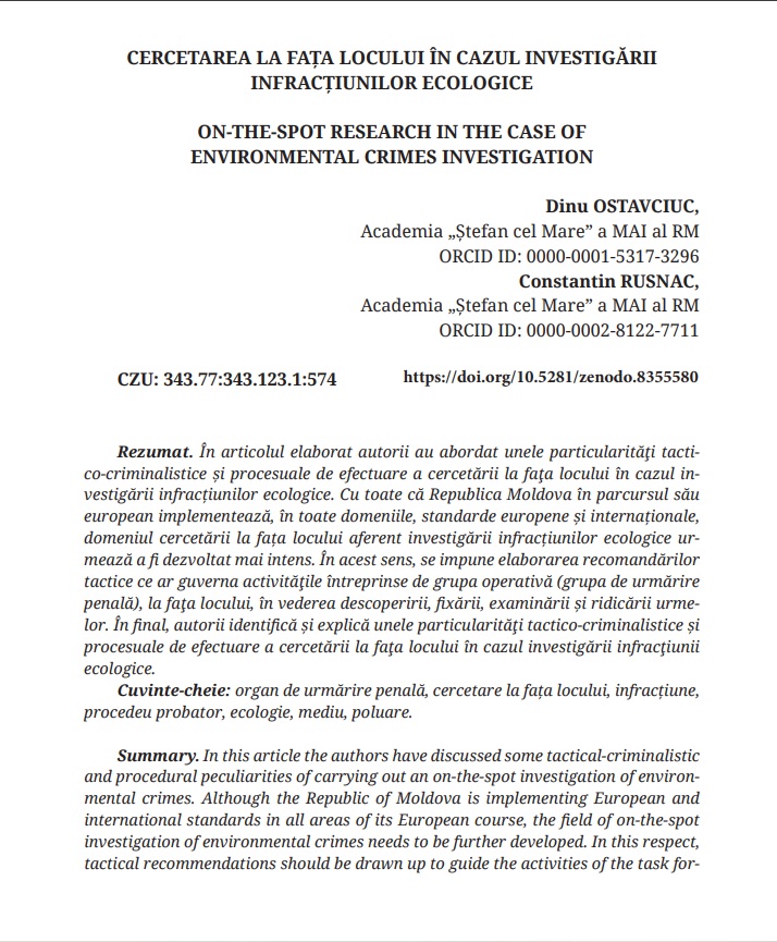 Cuvinte cheie:organ de urmărire penală, cercetare la fața locului, infracțiuni, procedeu probator, ecologie, mediu, poluare, infracţiuni ecologice