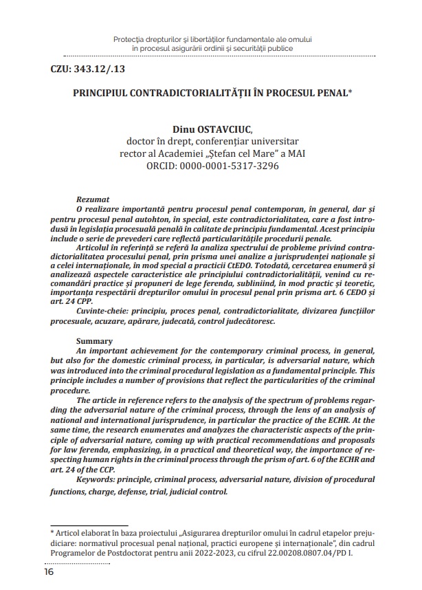 Informații la titlu:În: Protecţia drepturilor şi libertăţilor fundamentale ale omului în procesul asigurării ordinii şi securităţii publice: Materialele Conferinţei ştiinţifice cu participare internaţională, Ediţia a II-a, din 08 decembrie 2022 / comitetul ştiinţific: Dinu Ostavciuc (preşedinte) [et al.]; comitetul de organizare: Oleg Rusu (preşedinte) [et al.]. – Chişinău: Departamentul Editorial-Poligrafic al Academiei „Ştefan cel Mare", 2023, pp. 16-36.