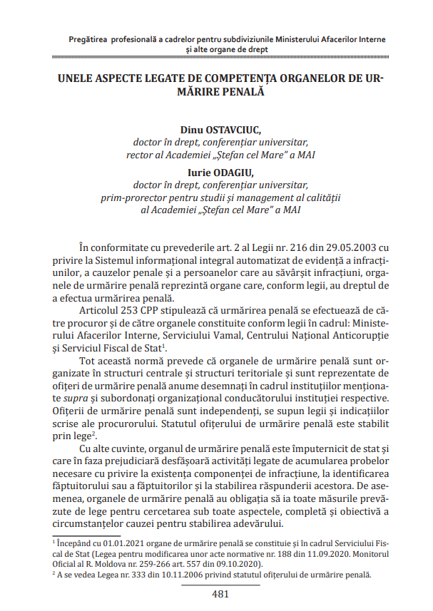 Informații la titlu:În: Pregătirea profesională a cadrelor pentru subdiviziunile Ministerului Afacerilor Interne şi alte organe de drept: Conferinţa ştiinţifico-practică internaţională din 4 decembrie 2020 / Academia „Ştefan cel Mare” a MAI al Republicii Moldova ; redactor-şef: Iurie Larii; colegiul de redacţie: Dinu Ostavciuc [et al.]. Chişinău: Departamentul Editorial-Poligrafic al Academiei „Ştefan cel Mare”, 2021, pp. 481-494