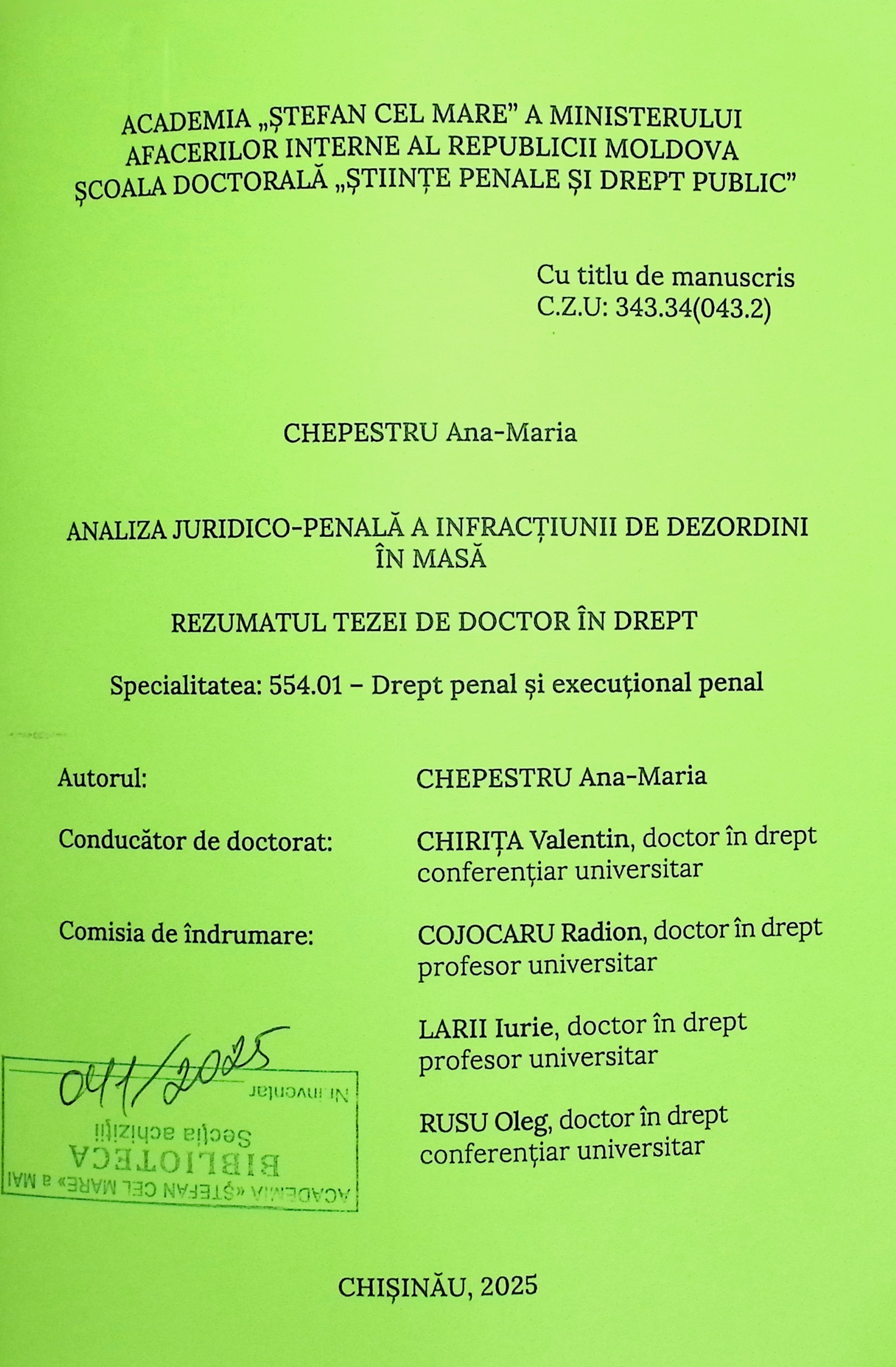 Mențiuni de repsonsabilitate:Academia „Ștefan cel Mare” a Ministerului Afacerilor Interne al Republicii Moldova. Școala Doctorală „Științe Penale și Drept Public”