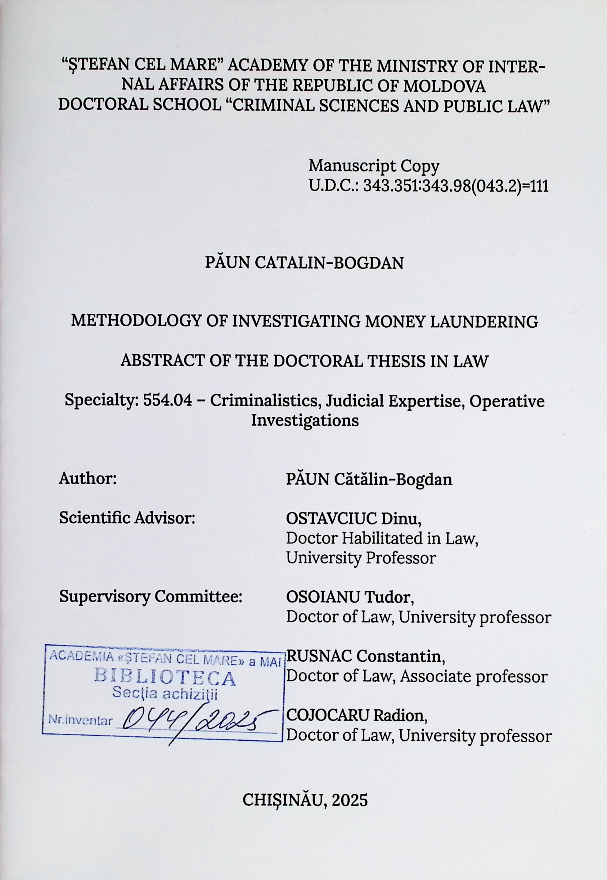 Mențiuni de repsonsabilitate:„Ștefan cel Mare” Academy of the Ministry of Internal Affairs of the Republic of Moldova, Doctoral School „Criminal Sciences and Public Law”