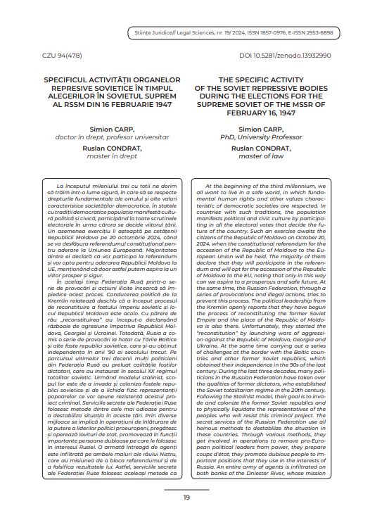 Titlu paralel:The Specific Activity of the Soviet Repressive Bodies During the Elections for the Supreme Soviet of the MSSR of February 16, 1947
