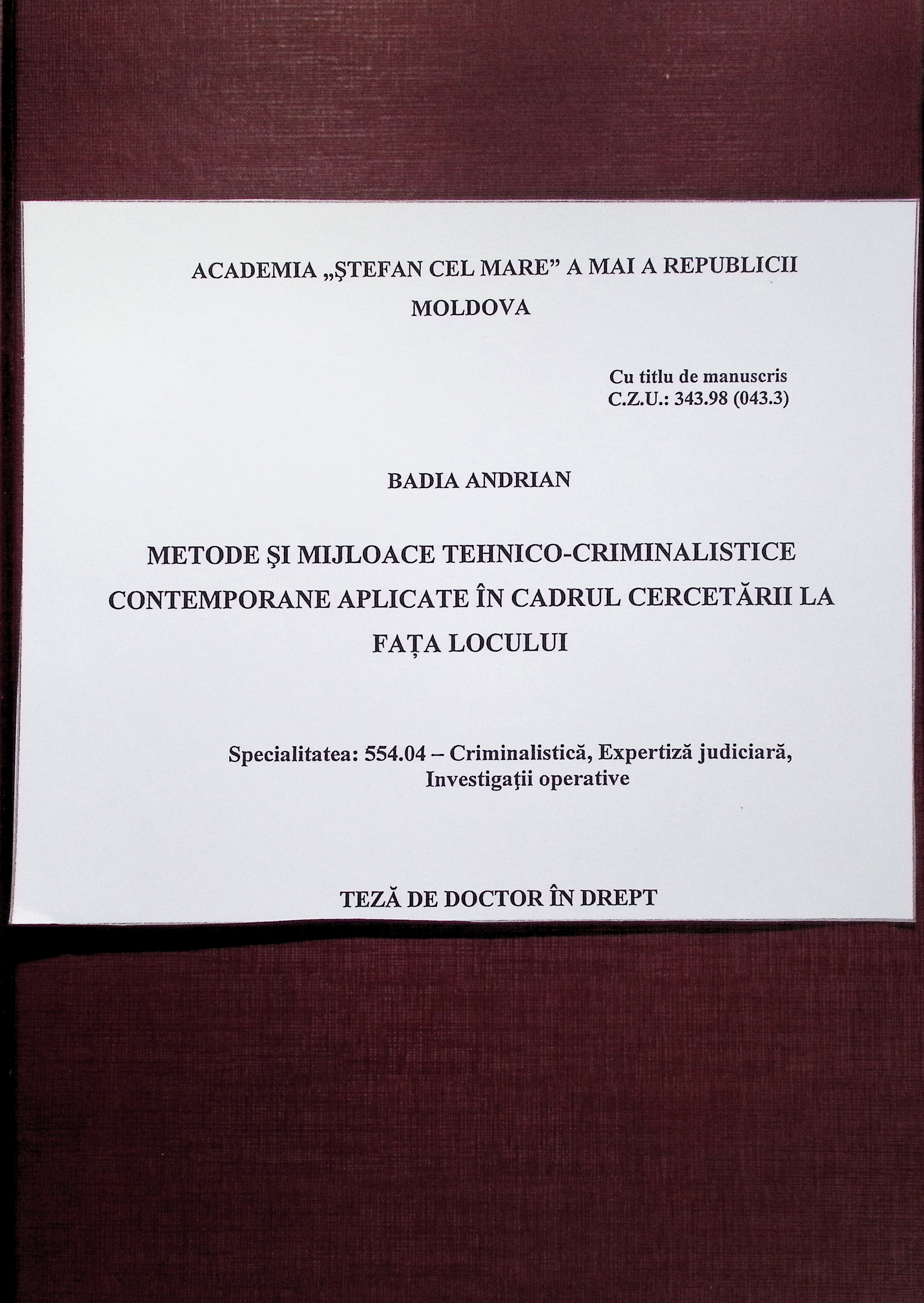Teză de doctor în drept. Specialitatea: 554.04 - Criminalistică, Expertiză judiciară, Investigații operative