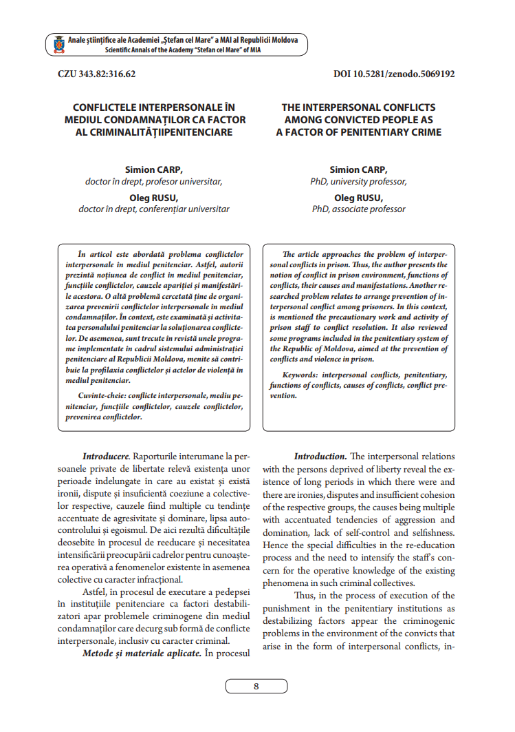 Titlu paralel:The Interpersonal Conflicts Among Convicted People as a Factor of Penitentiary Crime