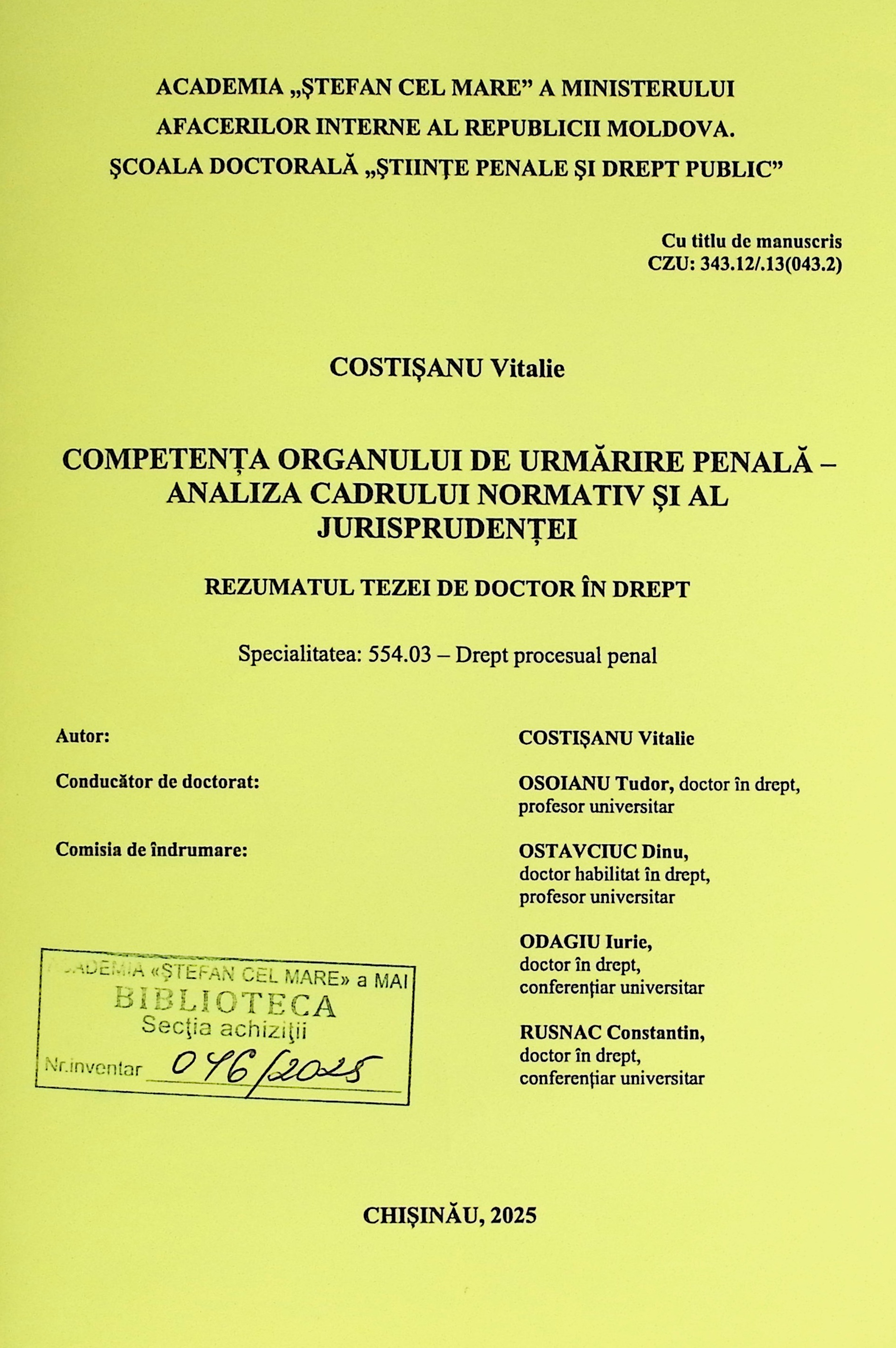 Mențiuni de repsonsabilitate:Academia „Ștefan cel Mare” a Ministerului Afacerilor Interne al Republicii Moldova. Școala Doctorală „Științe Penale și Drept Public”