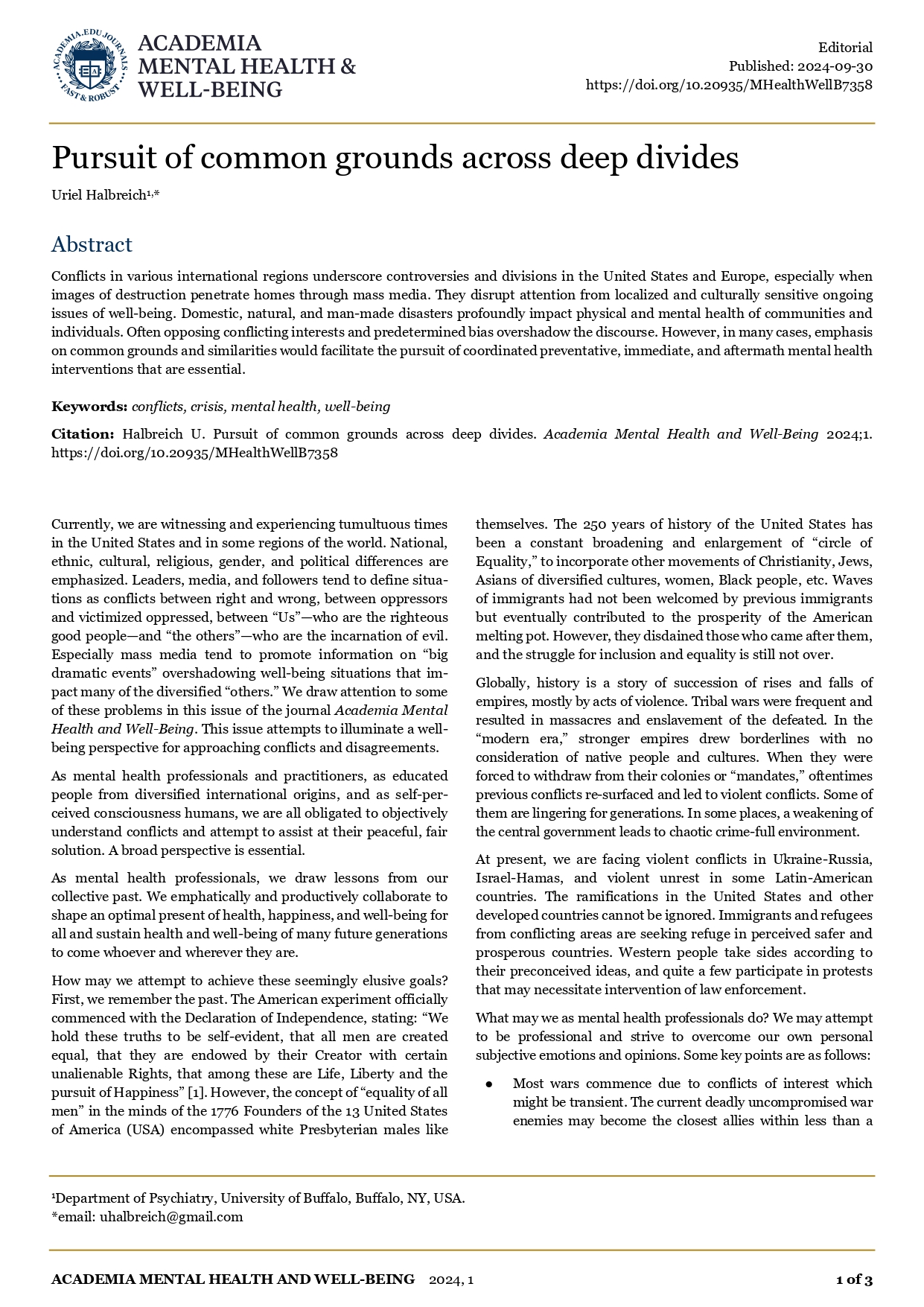 În: Academia Mental Health and Well-Being; Department of Psychiatry, University of Buffalo; 2024, 1; pp. 1 - 3