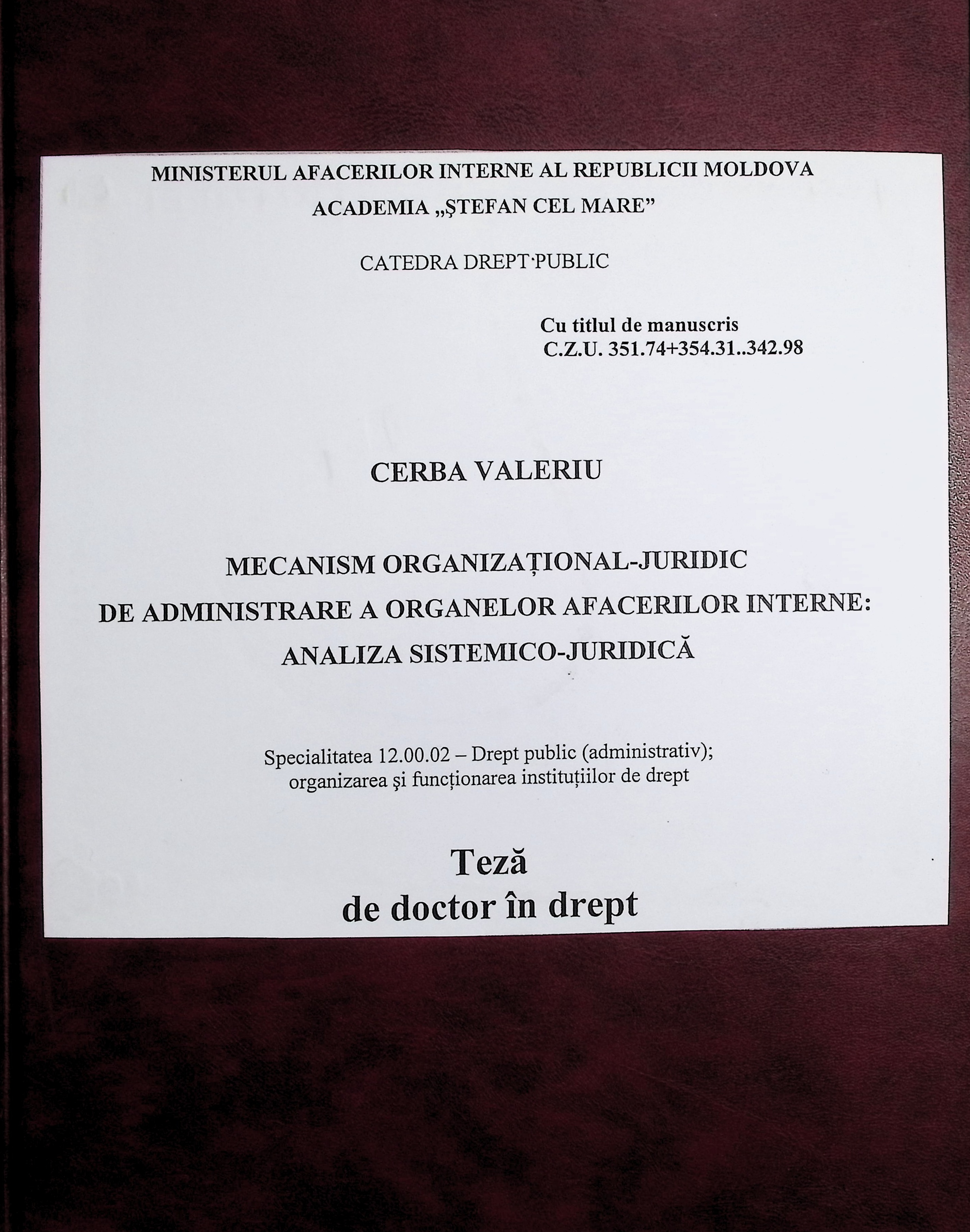 Informații la titlu:Teză de doctor în drept : Specialitatea 12.00.02 - Drept public (administrativ); organizarea și funcționarea instituțiilor de drept