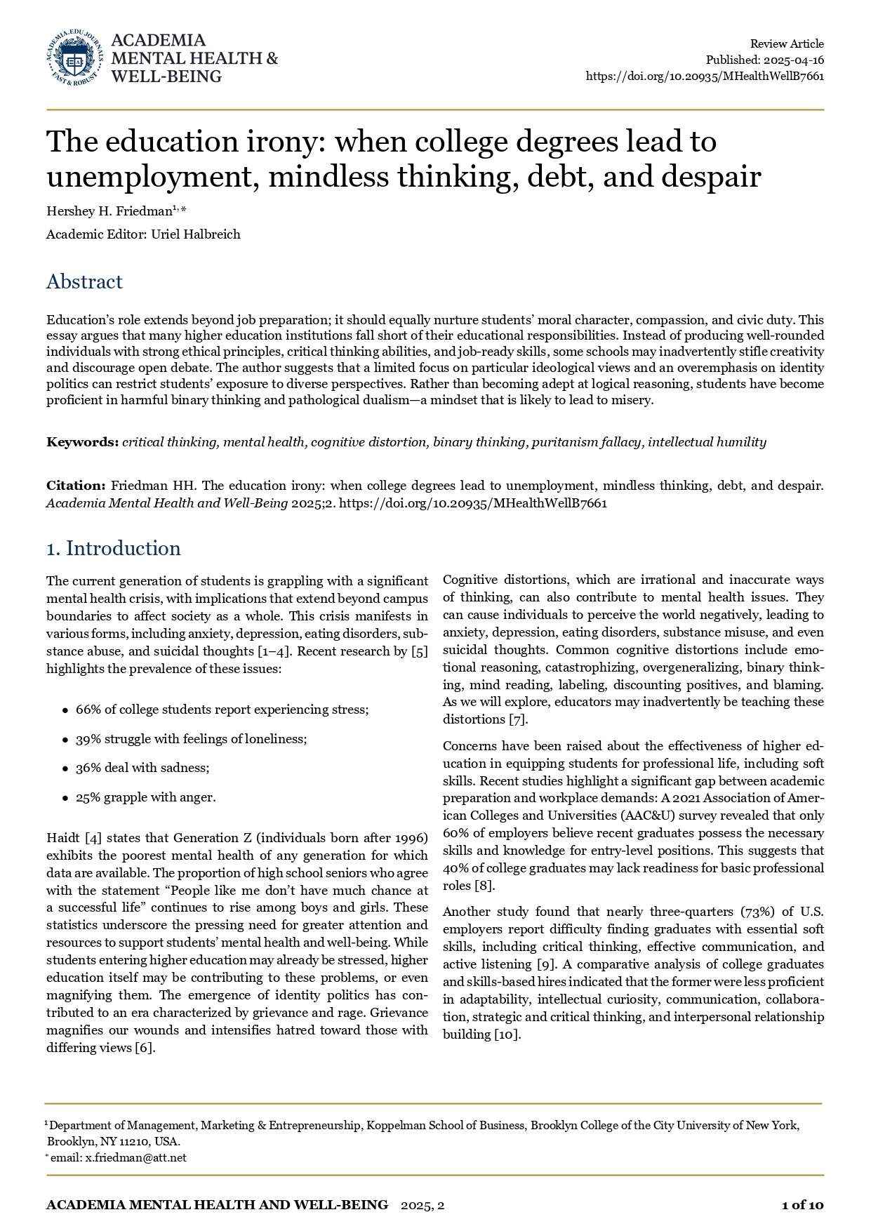 În : Academia Mental Health and Well-Being 2025; 2 / Academic Editor: Uriel Halbreich ; Published: 2025-04-16 ; pp. 1 - 10