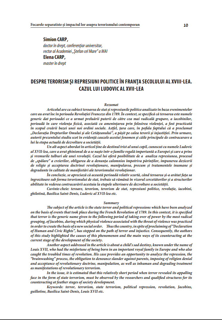 Cuvinte cheie:teroare, terorism, terorism de stat, represiuni politice, revoluţie, iacobini, ghilotină, Basilica Saint-Denis, Ludovic al XVII-lea