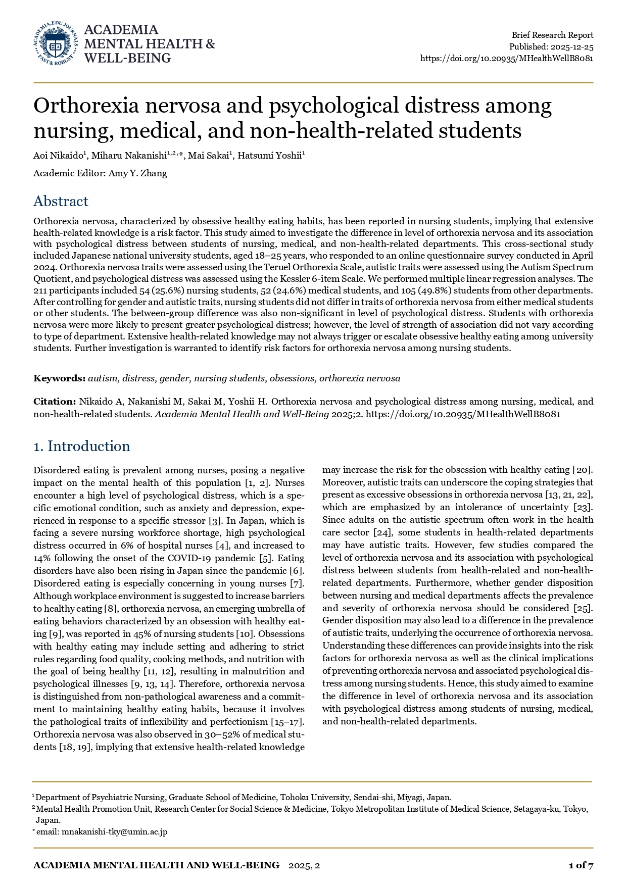 Denumirea:Orthorexia nervosa and psychological distress among nursing, medical, and non-health-related students