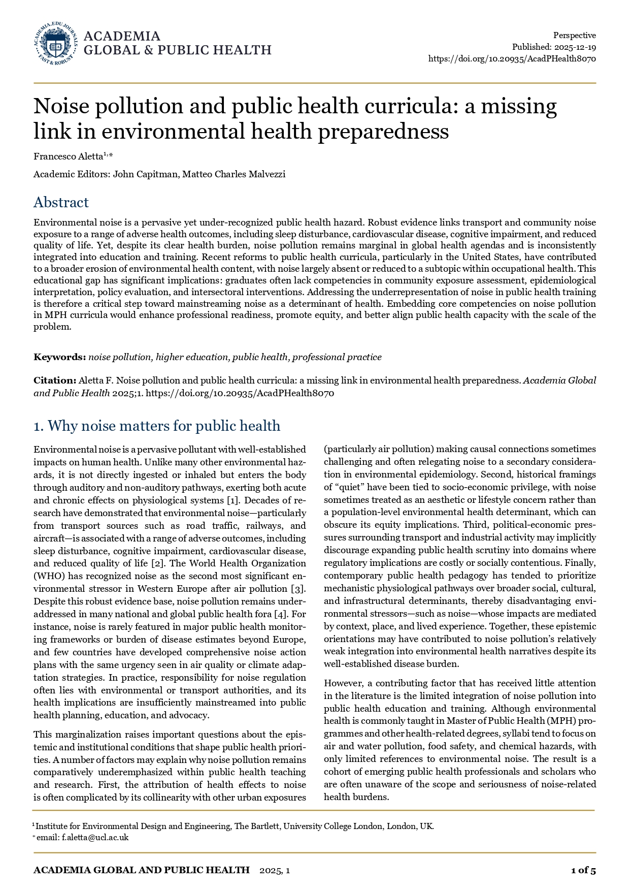 Informații la titlu:În: Academia Global and Public Health / Institute for Environmental Design and Engineering, The Bartlett, University College London, London, UK / Academic Editors: John Capitman, Matteo Charles Malvezzi / pp. 1 - 5