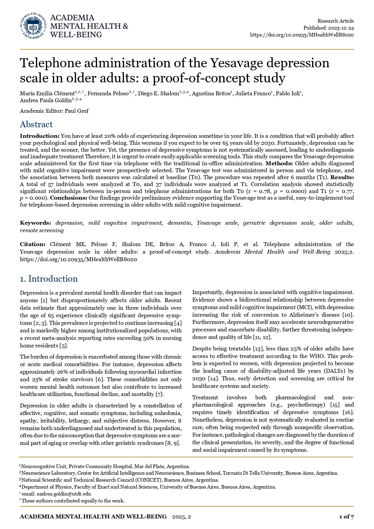 În: Academia Mental Health and Well-Being / Neurocognitive Unit, Private Community Hospital, Mar del Plata, Argentina. Neuroscience Laboratory, Center for Artificial Intelligence and Neuroscience, Business School, Torcuato Di Tella University, Buenos Aires, Argentina. National Scientific and Technical Research Council (CONICET), Buenos Aires, Argentina. Department of Physics, Faculty of Exact and Natural Sciences, University of Buenos Aires, Buenos Aires, Argentina / Academic Editor: Paul Grof / pp. 1 - 7