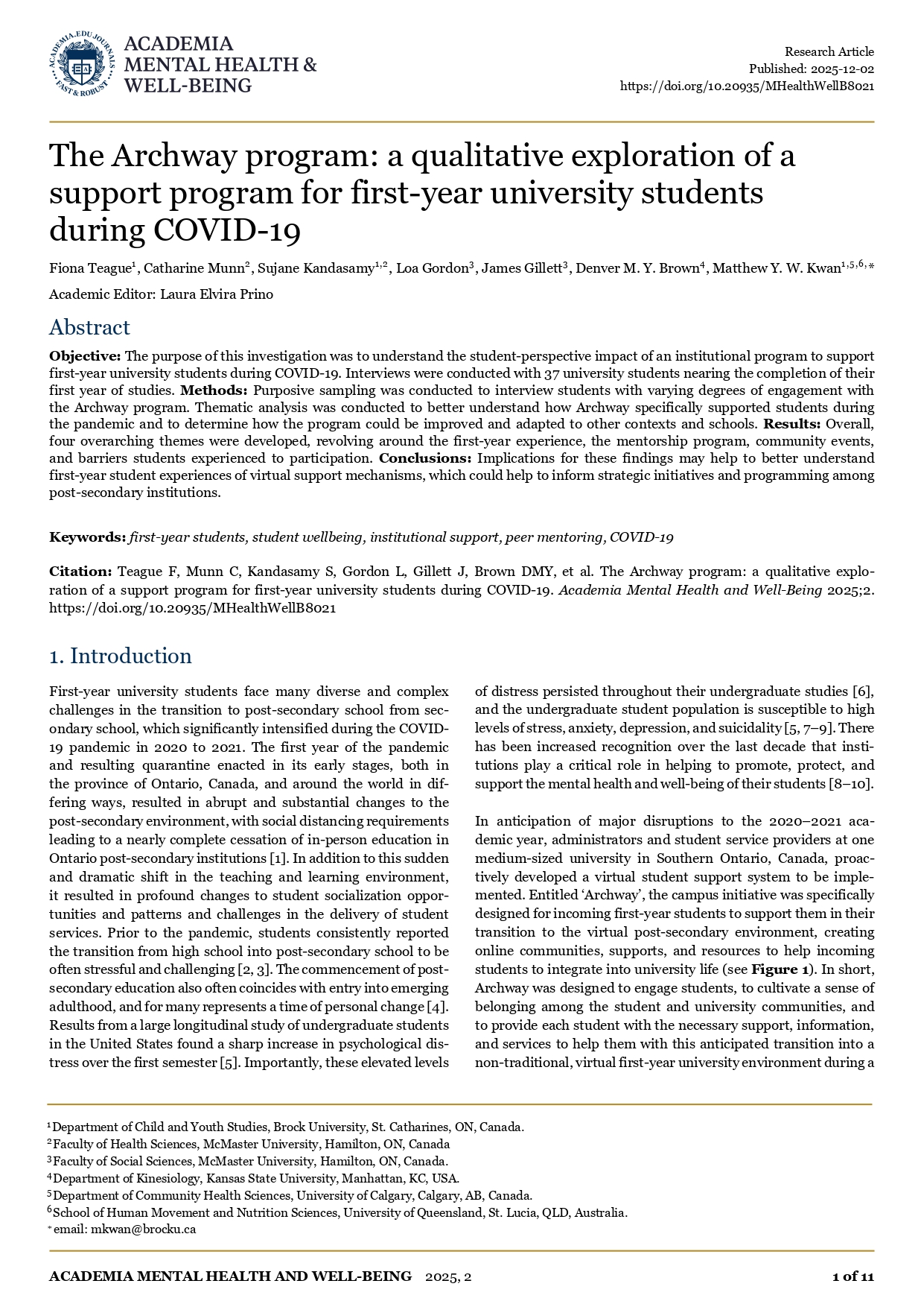 În: Academia Mental Health and Well-Being / Published: 2025-12-02 / Department of Child and Youth Studies, Brock University, St. Catharines, ON, Canada. Faculty of Health Sciences, McMaster University, Hamilton, ON, Canada. Faculty of Social Sciences, McMaster University, Hamilton, ON, Canada. Department of Kinesiology, Kansas State University, Manhattan, KC, USA. Department of Community Health Sciences, University of Calgary, Calgary, AB, Canada. School of Human Movement and Nutrition Sciences, University of Queensland, St. Lucia, QLD, Australia