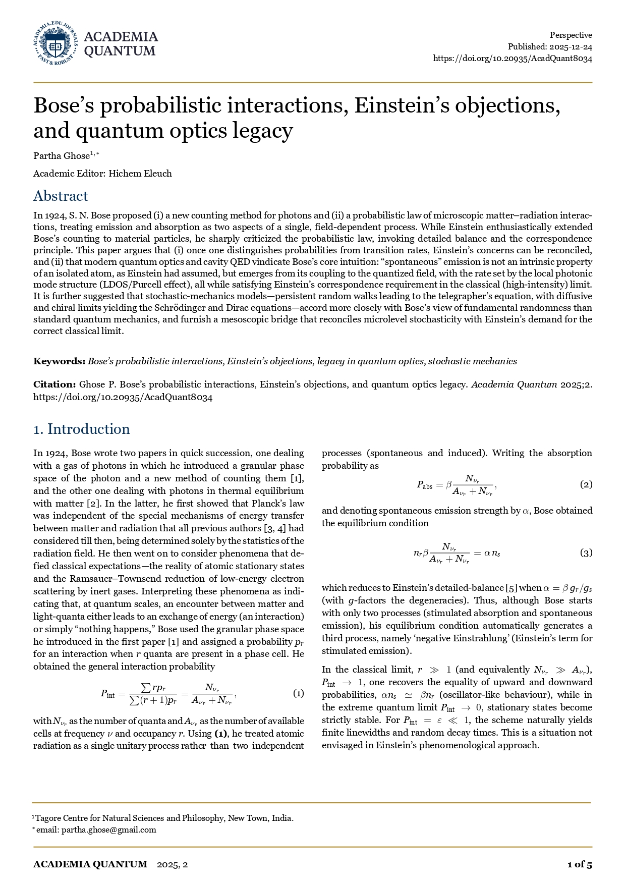 Denumirea:Bose’s probabilistic interactions, Einstein’s objections, and quantum optics legacy