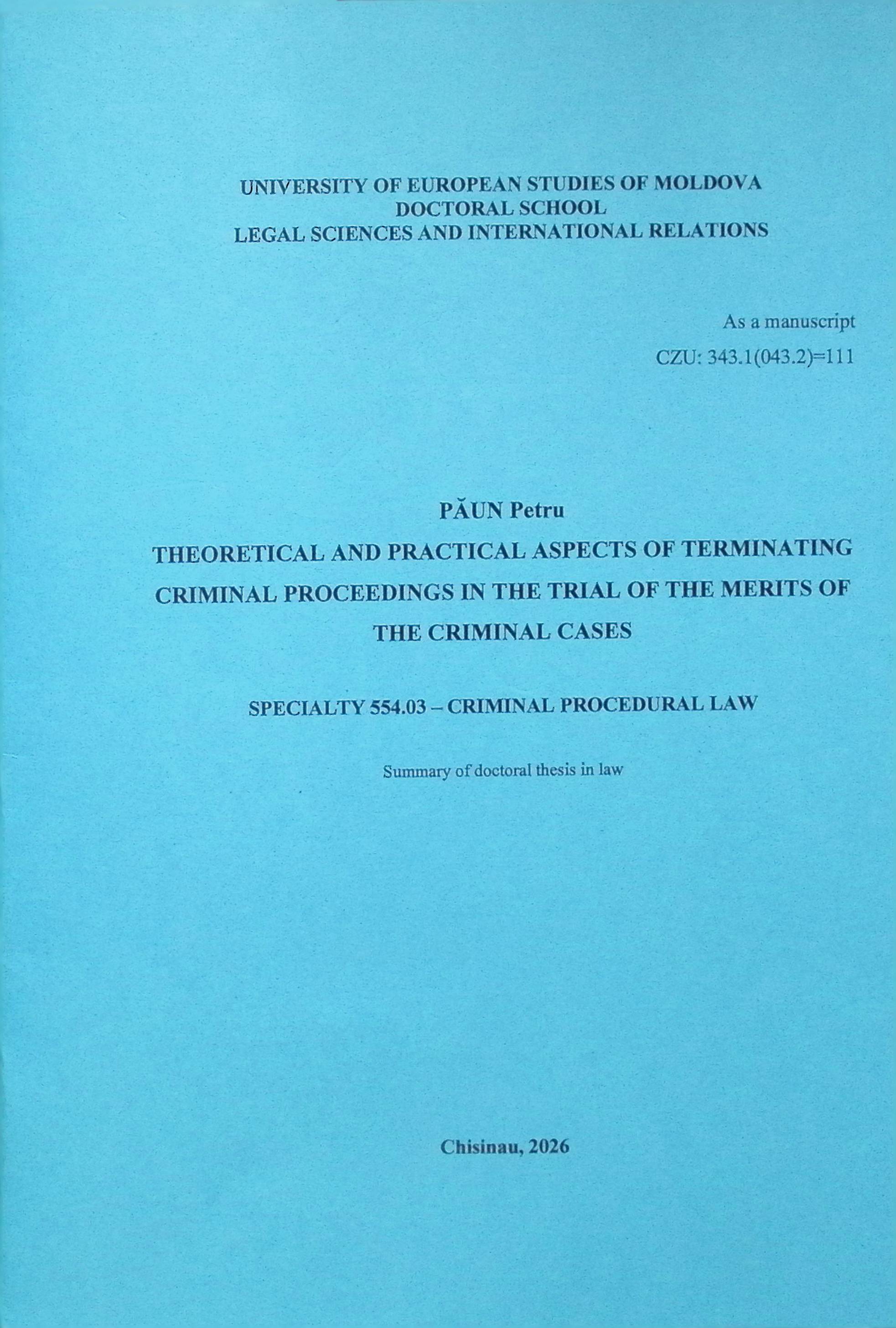 Denumirea:Theoretical and Practical Aspects of Terminating Criminal Proceedings in the Trial of the Merits of the Criminal Cases: Summary of Doctoral Thesis in Law