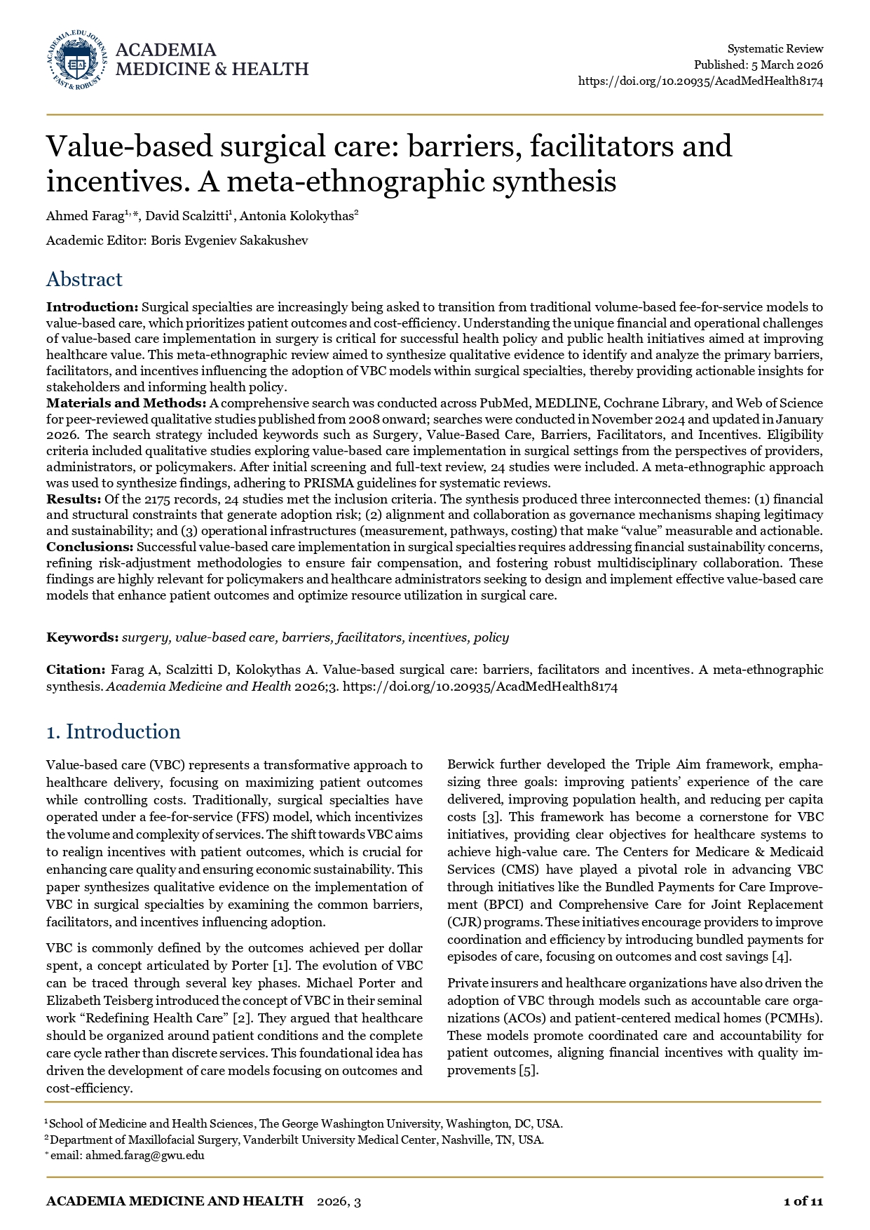 Informații la titlu:În: Academia Medicine and Health 2026; 3 / Published: 5 March 2026 / Academic Editor: Boris Evgeniev Sakakushev / School of Medicine and Health Sciences, The George Washington University, Washington, DC, USA. Department of Maxillofacial Surgery, Vanderbilt University Medical Center, Nashville, TN, USA