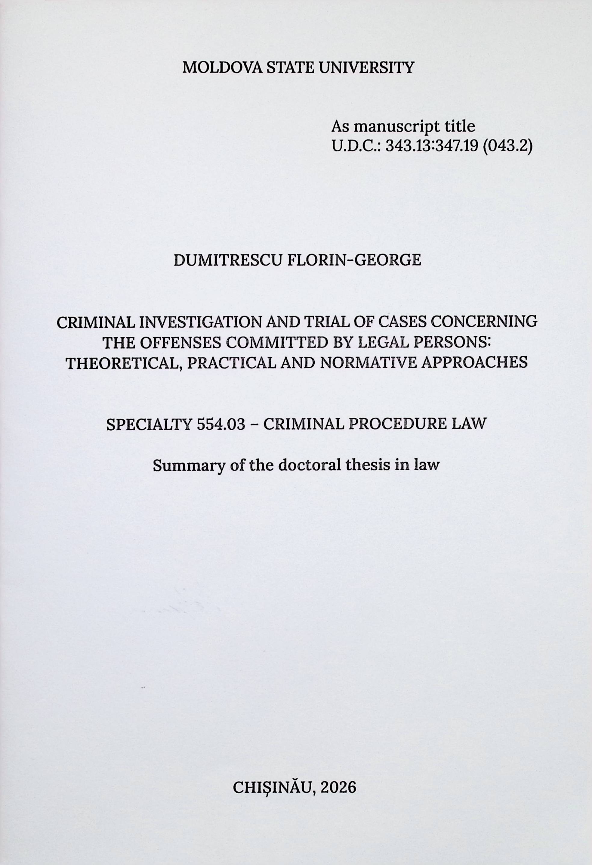 Denumirea:Criminal Investigation and Trial of Cases Concerning the Offenses Committed by Legal Persons: Theoretical, Practical and Normative Approaches: Summary of the Doctoral Thesiss in Law