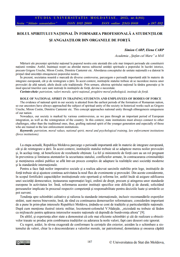 Название:Rolul spiritului național în formarea profesională a studenților și angajaților din organele de forță