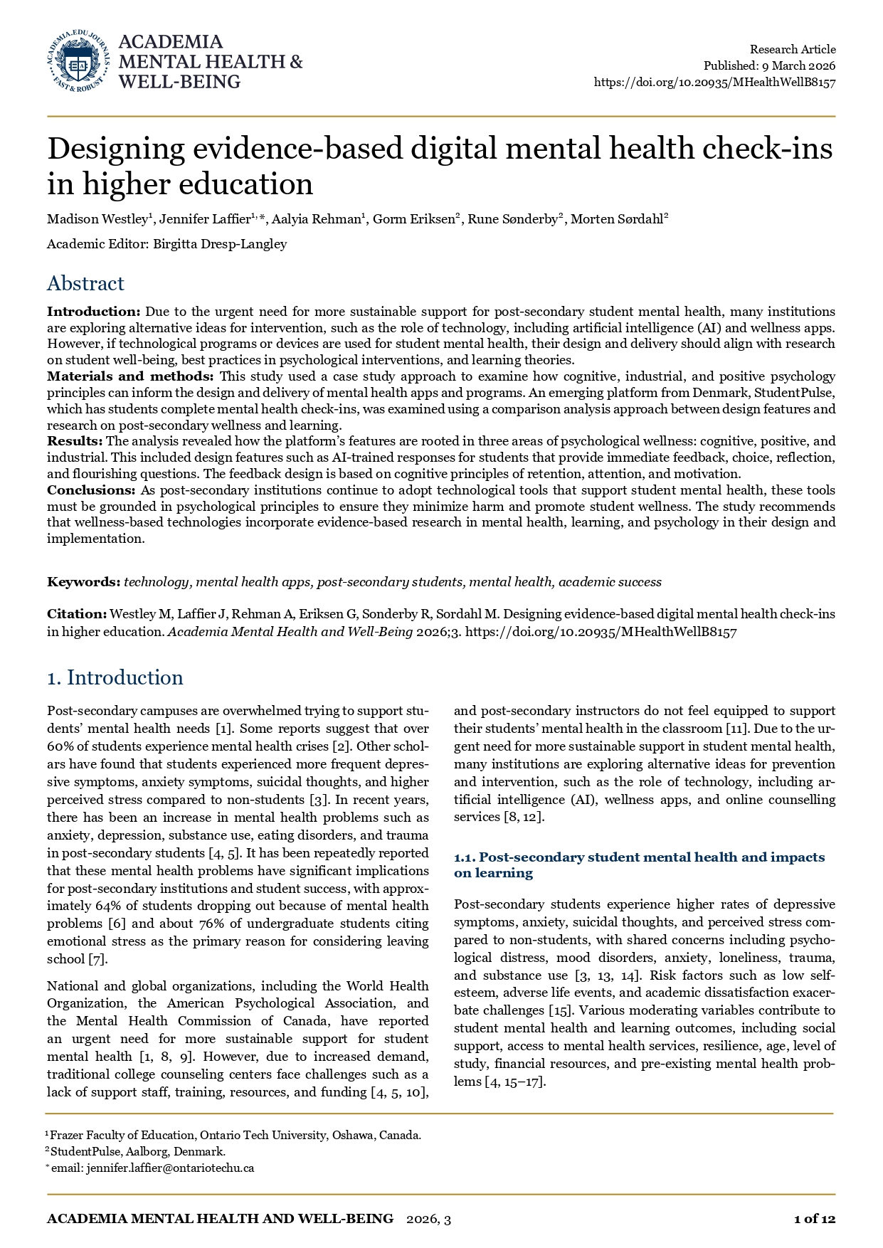 Информация к названию:În: Academia Mental Health and Well-Being / Published: 9 March 2026 / Academic Editor: Birgitta Dresp-Langley / Frazer Faculty of Education, Ontario Tech University, Oshawa, Canada. StudentPulse, Aalborg, Denmark